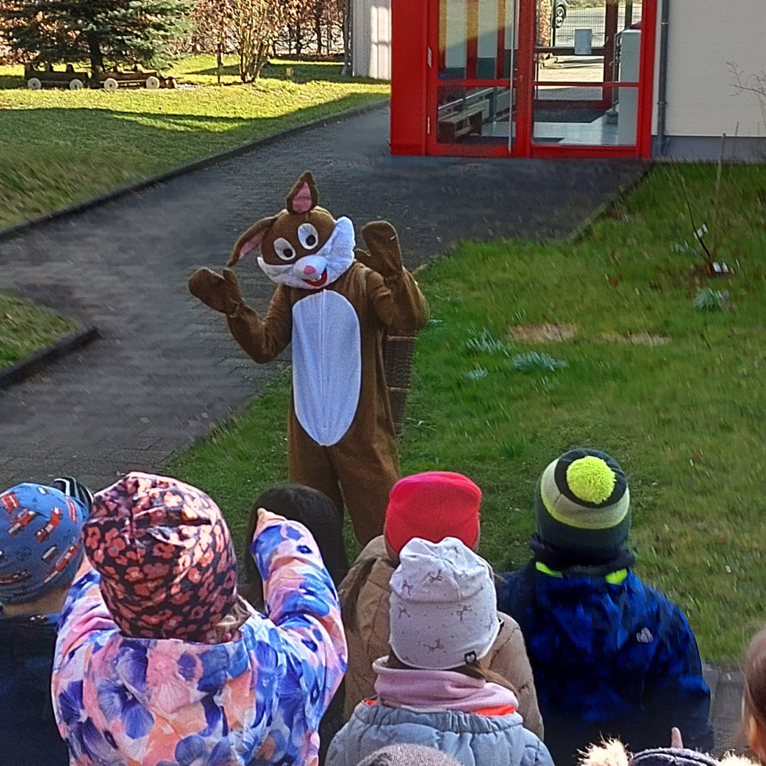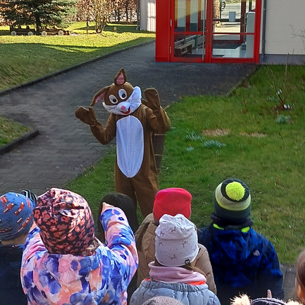 Bei frühlingshaftem Wetter überraschte er die Kinder im Garten mit einem großen Heukorb, gefüllt mit vielen bunten Osterüberraschungen.