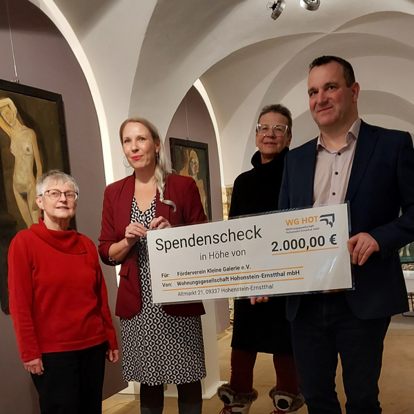 Im Rahmen unseres jährlichen Spendenaufrufs zum Jahresende konnten wir dank der großzügigen Beiträge unserer Geschäftspartner eine Spendensumme von 1.230 € sammeln. Diese haben wir als städtische Wohnungsgesellschaft und Vermieter der Räumlichkeiten der „Kleinen Galerie“ gern auf insgesamt 2.000 € aufgestockt und an den Förderverein „Kleine Galerie“ e. V. übergeben.