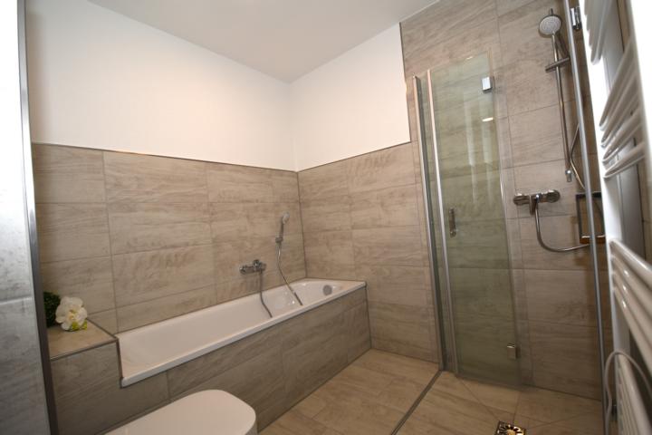 *modern gefliestes Bad mit ebenerdiger Dusche sowie LED-Deckenspots